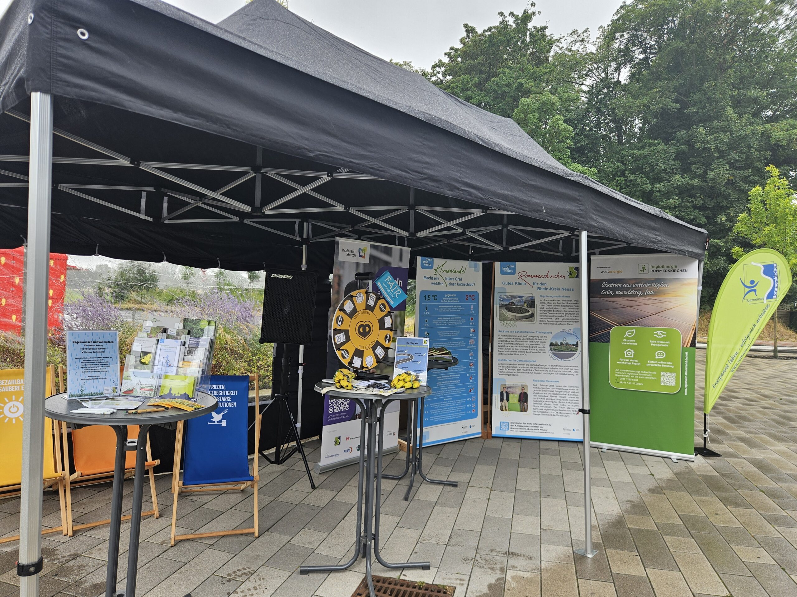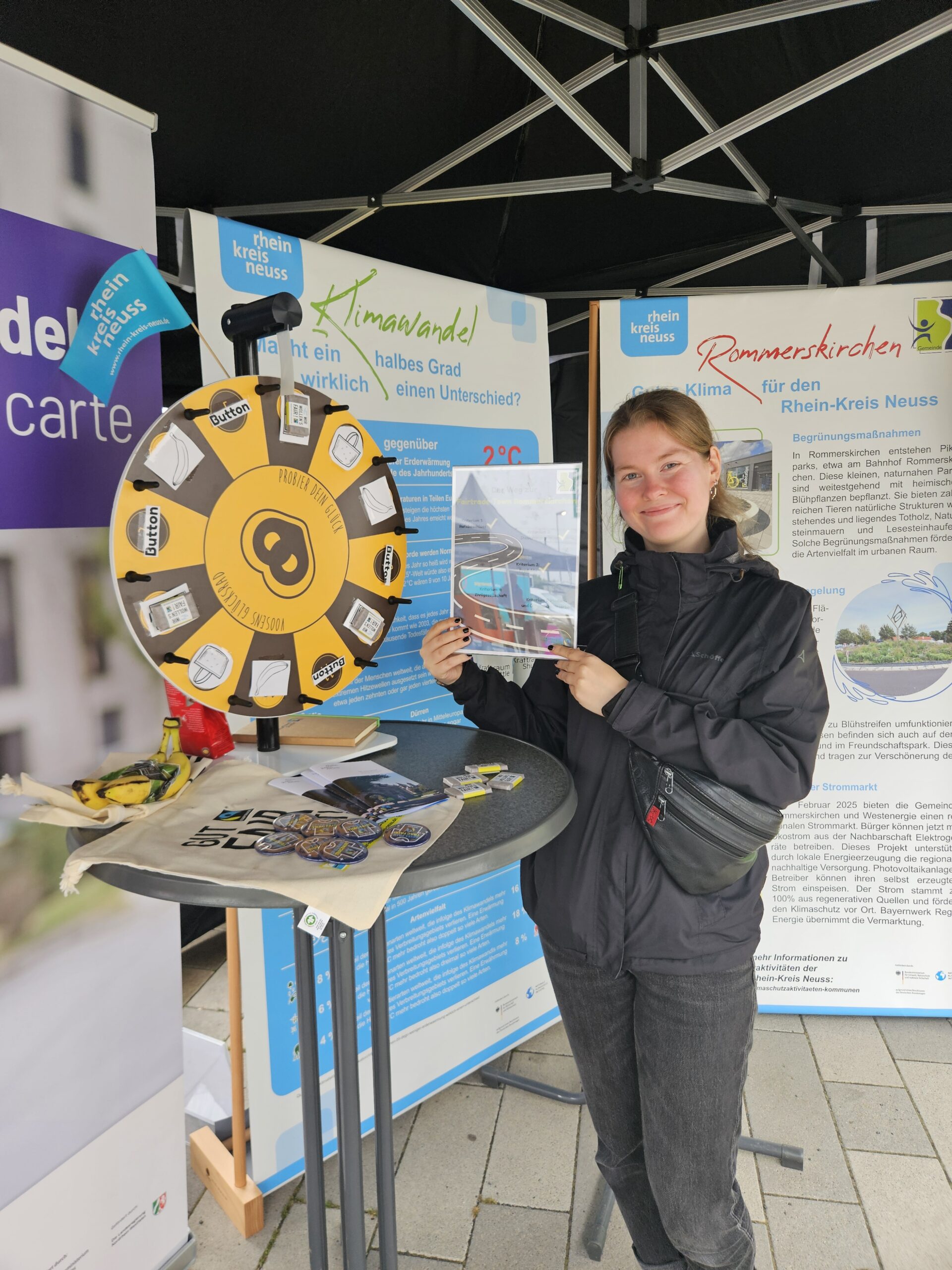 Auch die Gemeinde selbst war mit einem Stand vertreten. Dort konnten am Fairtrade-Glücksrad faire Preise gewonnen und Teile der Wanderausstellung „Gutes Klima für den Rhein-Kreis Neuss“ begutachtet werden. Am späten Mittag wurden die Siegerinnen und Sieger des Logo-Wettbewerbs Klimaschutz und Nachhaltigkeit gekürt. Die Kinder zwischen 8 und 10 Jahren konnten sich über Gutscheine von Spielwaren Siegert, Eiscafé Portofino, Feldbahnmuseum Oekoven und dem Sonnenbad freuen.