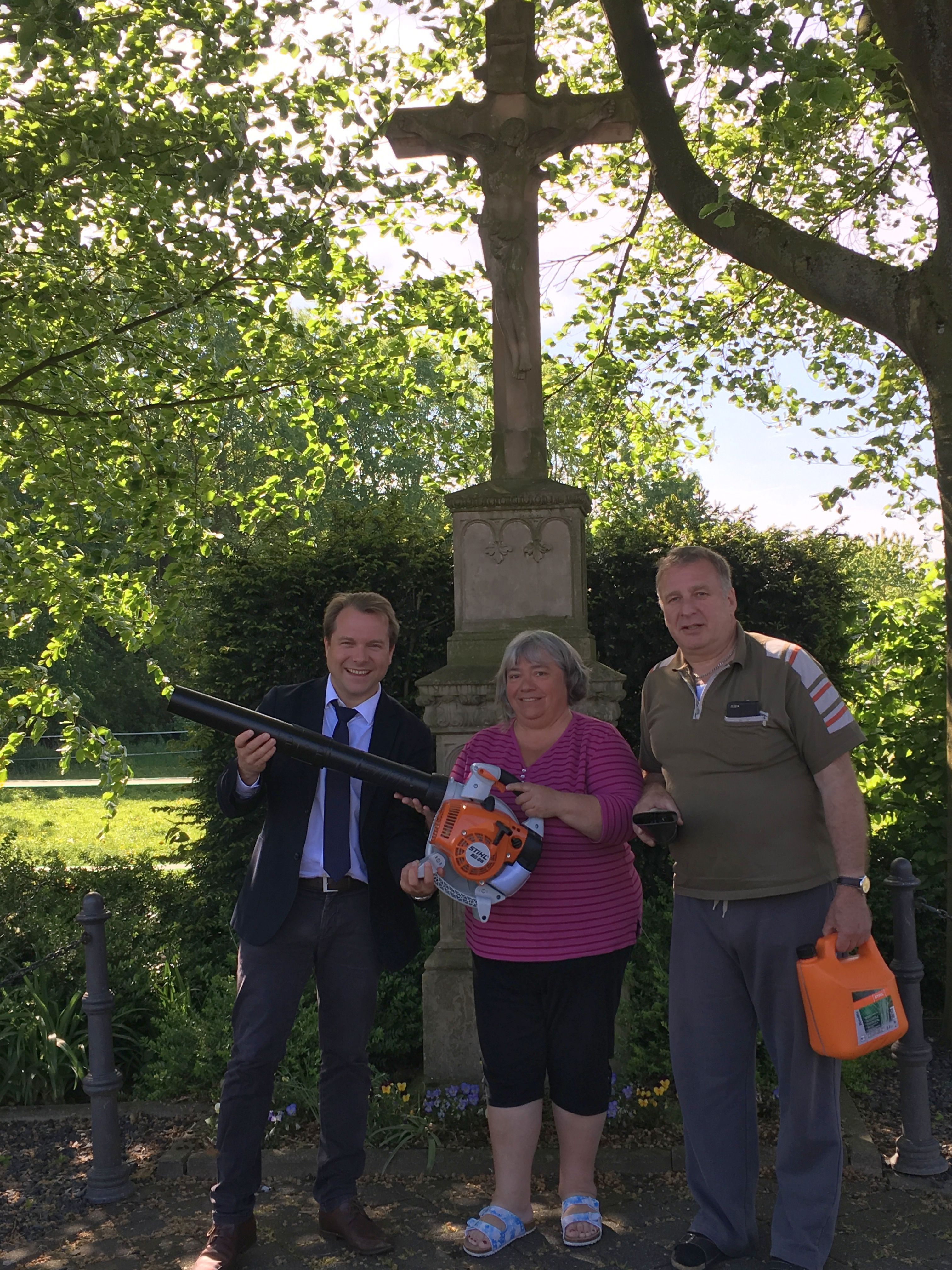 Bürgermeister Dr. Mertens hat es sich deshalb nicht nehmen lassen und sich persönlich bei der Schützenbruderschaft bedankt. Karoline Kahm und Hans-Willi Kahm haben stellvertretend für die Aktiven Frixheimer ein Laubbläser überreicht bekommen.