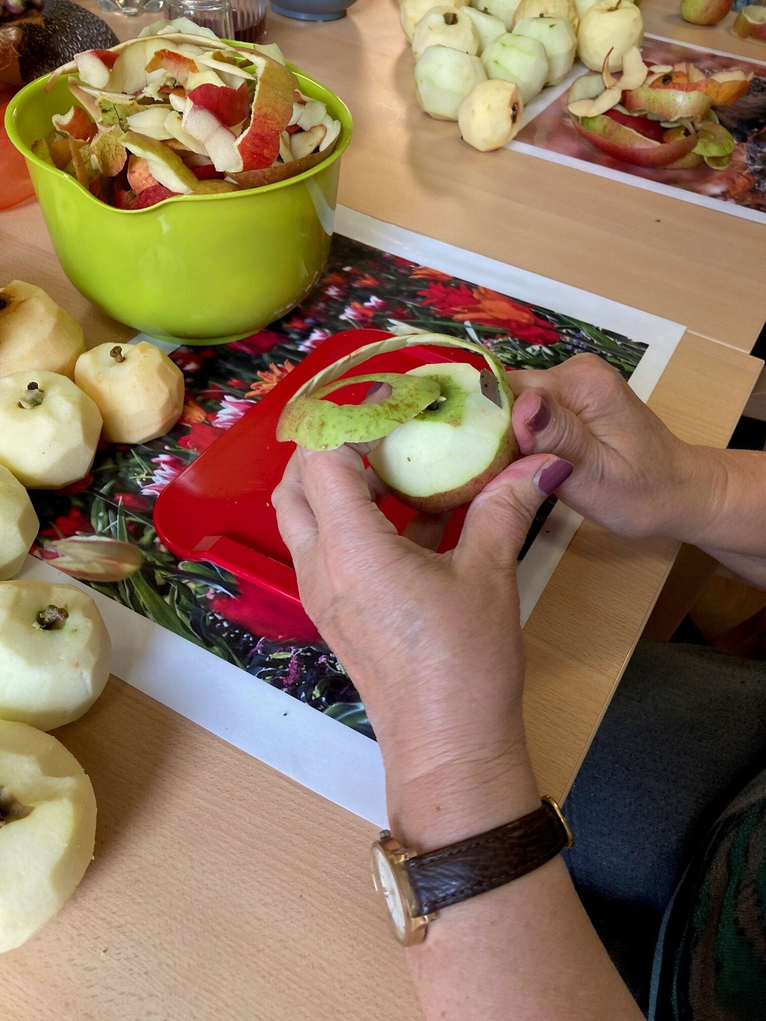 Die Aktion fand am vergangenen Mittwoch auf drei Stationen des Caritashauses statt. In der hauseigenen Küche des Altenheims wurden die Äpfel geschält, geschnitten und unter reger Beteiligung der Bewohner:innen zu Apfelmus verarbeitet. Dabei wurden nicht nur Erinnerungen an eigene Gärten und frühere Einmachaktionen wach, sondern das Schälen und Kleinschneiden förderte auch die Motorik der Bewohner:innen – die die Gemeinedemitarbeiterinnen, in Sachen Tempo und Akuratesse, teils deutlich überflügelten.