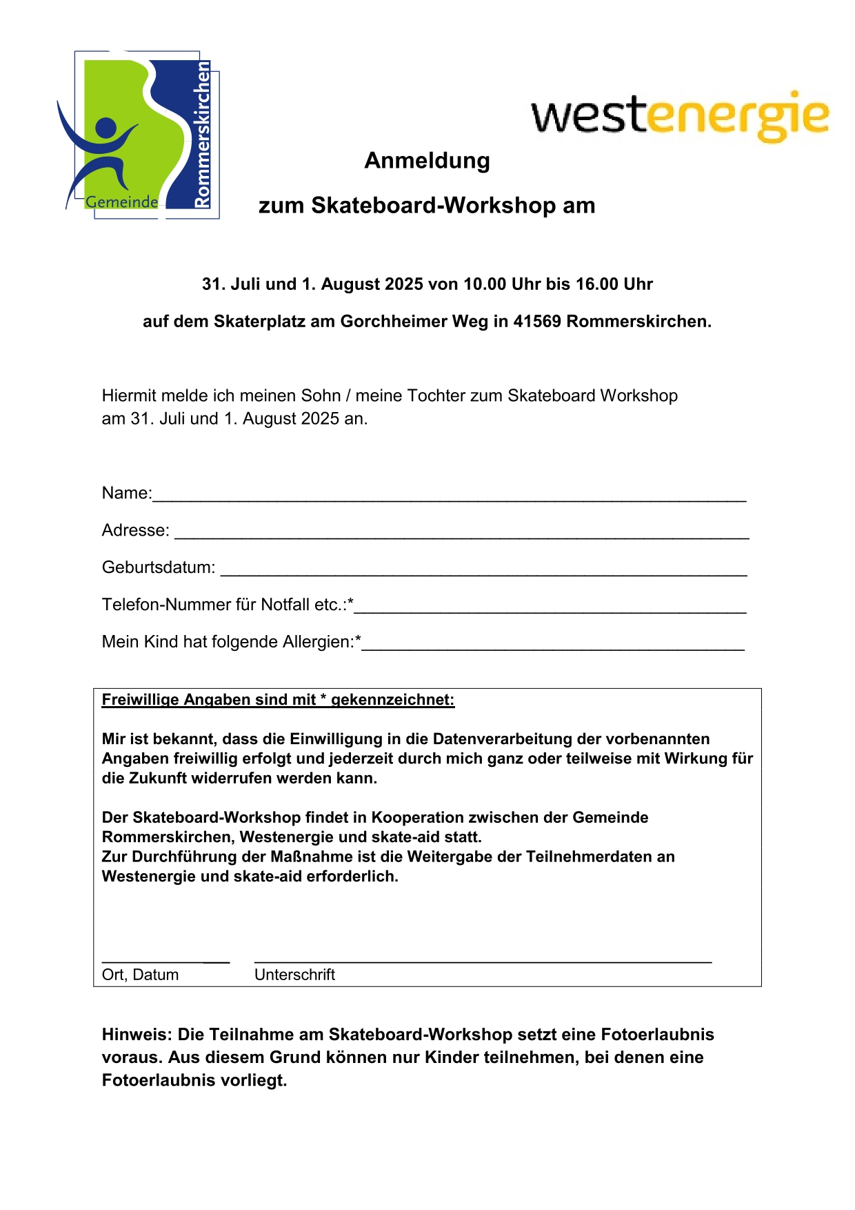Anmeldung zum Skateboard-Workshop am 31. Juli und 01. August von 10.00 Uhr bis 16.00 Uhr auf dem Skaterplatz am Gorchheimer Weg in Rommerskirchen.