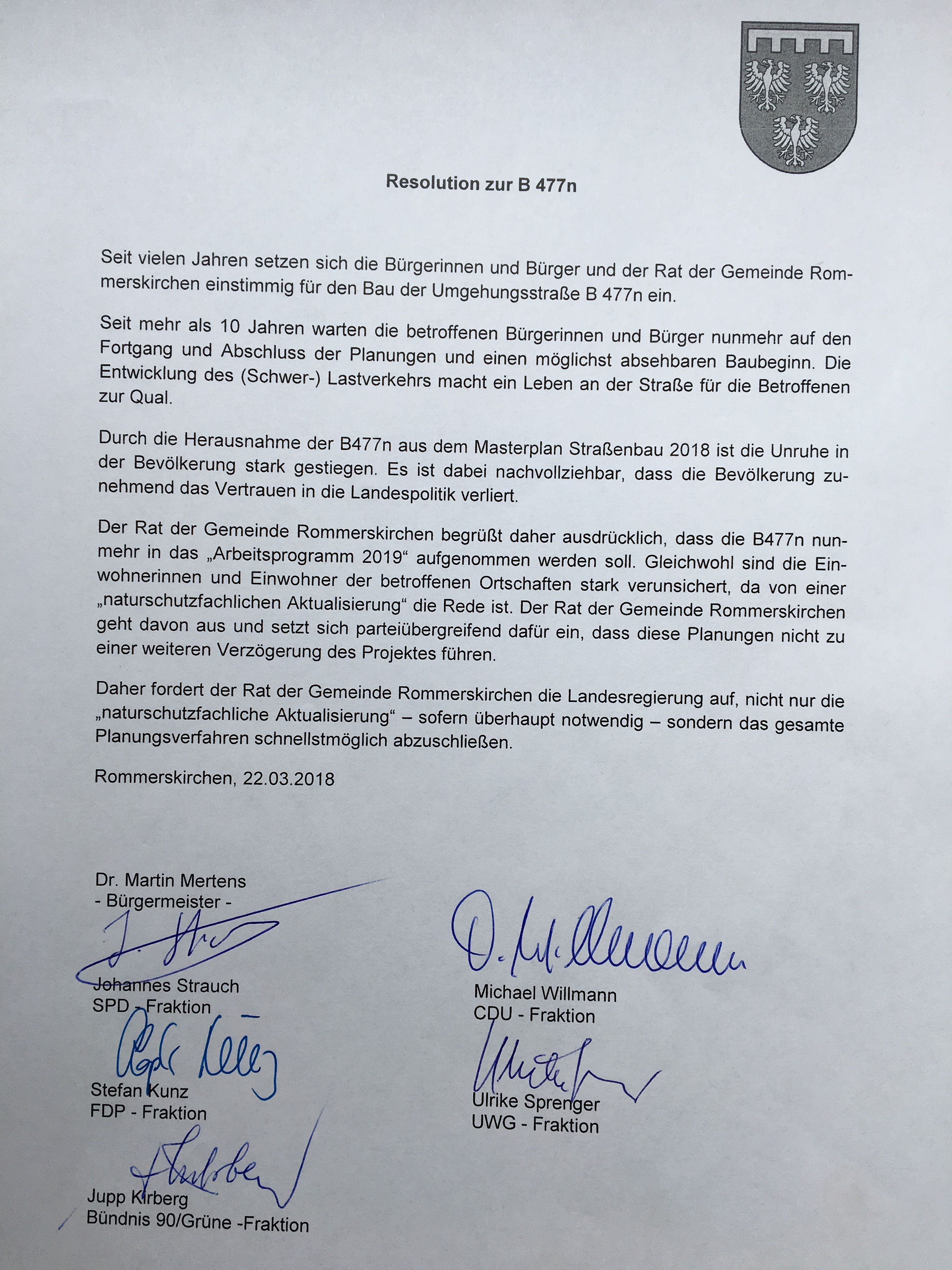 Rat verabschiedet fraktionsübergreifend einstimmig Resolution zur B477n – Bürgermeister Dr. Mertens bittet Minister Hendrik Wüst um Klarstellung