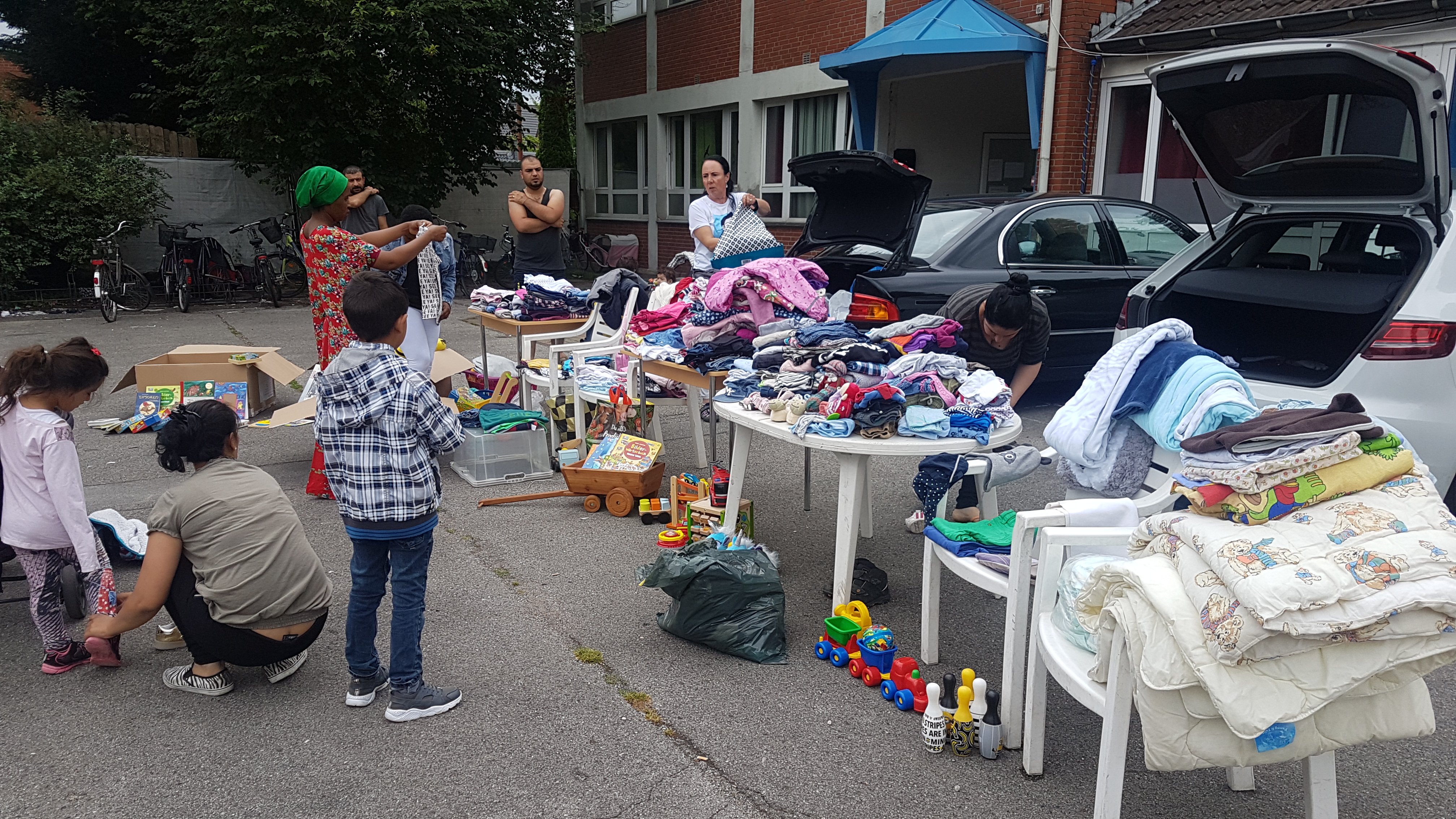 In Kooperation mit dem Sozialamt wurden die Familien mit Fluchterfahrung dazu eingeladen, sich am 13.6.18 in der Kastanienallee einzufinden und nach Spielmaterial, Bettwäsche und Kleidung zu schauen. Hierbei halfen schon am Morgen Mütter der Tageseinrichtung, die Kisten aus den Autos zu räumen und ansprechend auf den Tischen zu verteilen. Die Mütter schauten gemeinsam die Kleidung durch und halfen sich gegenseitig beim Aussuchen und Verteilen. Die kleinen Gäste wuselten durch das Spielzeug. Das ein oder andere Spiel wurde schon vor Ort ausgepackt und ausprobiert.